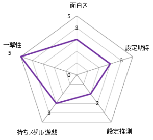 | 設定期待 | 3 | スマスロであり導入台数が10,000台といったところから導入当初は高設定に期待することができるでしょう。 |